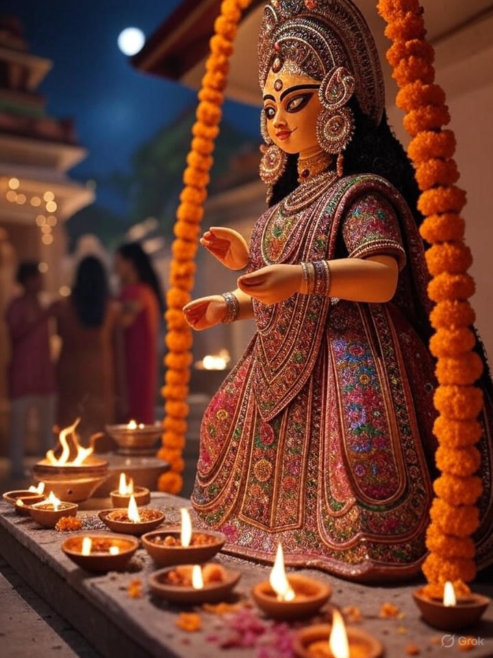 At home, devotees set up an idol or picture of the goddess, light a lamp continuously (Akhand Jyoti), and recite Durga Saptashati or other slokas like Devi Mahatmyam. Some also perform Kanya Pooja on the eighth or ninth day, symbolizing respect for girl children as forms of the goddess. Fasting is commonly observed to purify the body and mind.