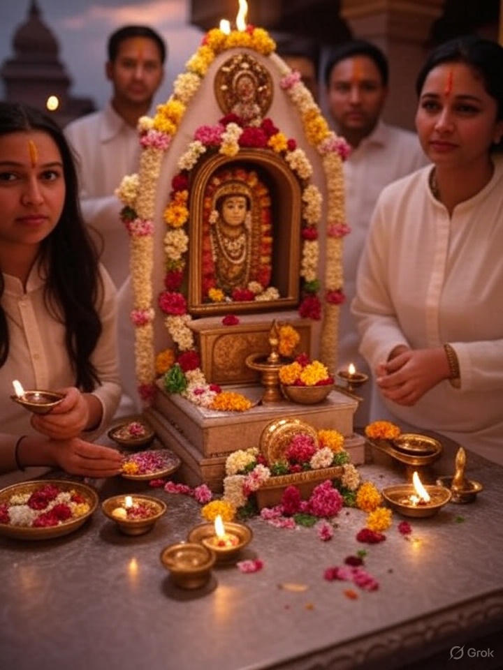 The altar is decorated with flowers, butter, curd, and toys that depict scenes from Krishna’s childhood. A small cradle or swing is often used to rock the idol of baby Krishna. After the midnight aarti and offerings, the fast is broken with prasad, usually including butter, sweets, and fruits.