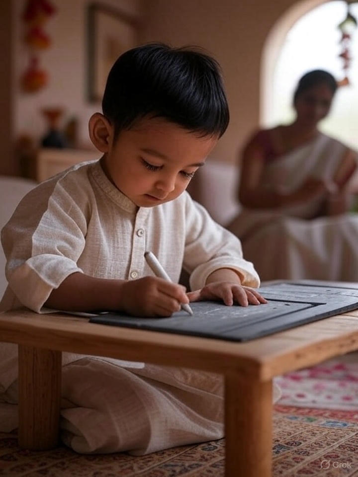 The child is helped to write their first letters—often “Om” or alphabets—on a tray of rice or a slate, guided by a guru or parent. A pooja to Goddess Saraswati is conducted with offerings of books, flowers, and sweets. Mantras are recited to bless the child’s intellect and remove learning obstacles.